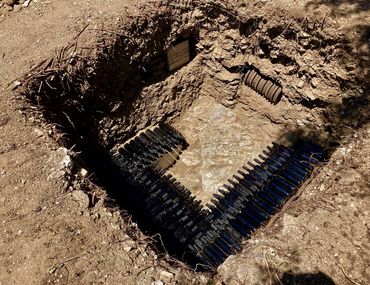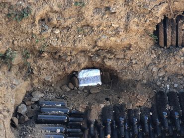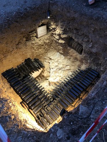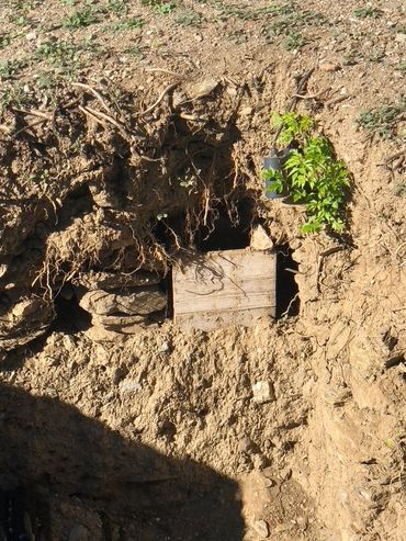 Absorbing the specific regional circumstances of the selected location, the sculptural intervention into the bowels of Arnados emerges as a vertiginous descent into the depths of abyss, where ritual sacrifice and sacred ecstasy, death and eroticism coexist. The outcome of the violent rupture of the Tinian earth and the subsequent insertion of 300 bottles of red wine, 2 wooden boxes, 41 clay disks impressed with extracts from the Hymn to Apollo, and a voluminous semi-reflective boulder, the gapping pit of the Concealment embodies the structural violence of death and eroticism.