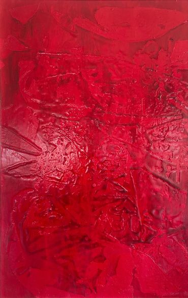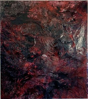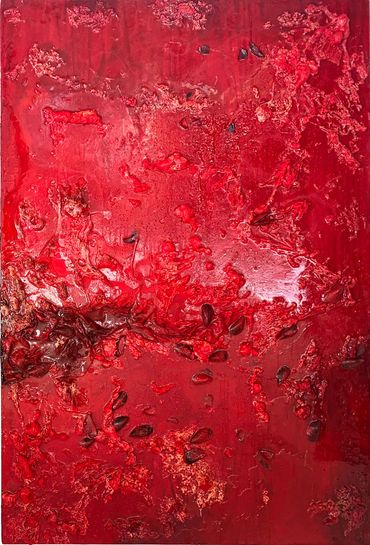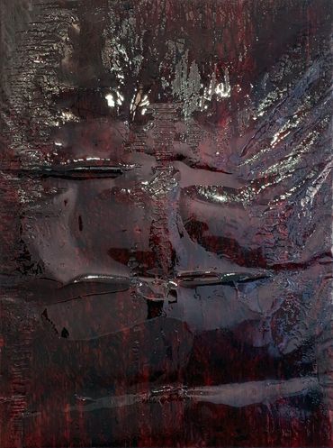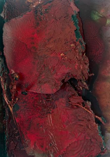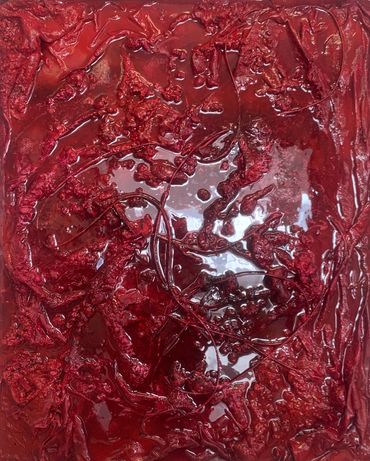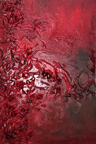 In this ritual schema, the visceral anatomical plasticity of the sanguinary red surfaces of Dafni Atha’s Proliferation series supplements the ritual character of the exhibition as a preparatory stage leading to catharsis. Combining painting, photography and prints, the series focuses on the visual exploration of the anatomical micro-variations of heterogeneous surfaces, textures, natural elements and body parts. Through the macrophotographic rendering of various found objects, specific details are appropriated, which, perpetually repeated, produce abstract compositions of irregular elements. Drops of undissolved paint, resins with wet textures, solid shellacs, Mytilidae and Ostreidae become the visceral elements of large-scale hemorrhagic compositions. The abject anatomical veracity, combined with the organic, squishy finishes, triggers an unsettling correlation with blood sacrifices that preceded catharsis.