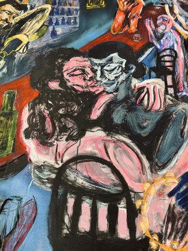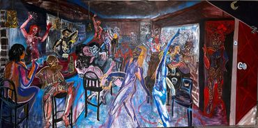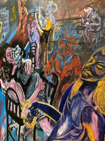 Diamantidou's depictions of Athens' nightlife align with a long tradition of artists exploring the after-hours world, as epitomised by Post-Impressionists who were fascinated by bars, cafes, and the bohemian underworld. However, unlike the romanticised portrayals of Athens, Night Shift is stripped of any sense of artificial luxury or nostalgic fantasy. Diamantidou’s Athens is a city in transition; its nightlife is neither purely celebratory nor simply indulgent. Instead, her works reveal a more complex and challenging terrain, where leisure intertwines with existential doubts, and the night becomes a space of revelation for primal desires, fears, and transformations. The central composition of the exhibition is emblematic of this perspective. In it, Diamantidou captures a moment from contemporary Athenian nightlife during a period when the city's urban anthropogeography is undergoing acute changes. The reinvestment in low-income neighborhoods has led to rapid gentrification, transforming not only the physical landscape but also the forms of entertainment. Formerly spontaneous, raw spaces of interaction have been replaced by controlled, sanitized environments designed to cater to the performative aspect of nightlife—where people come and go in a choreographed procession of appearances.
