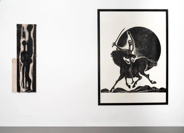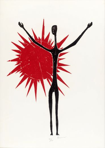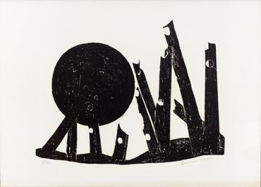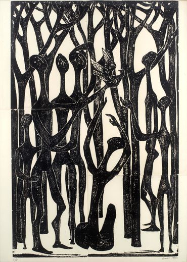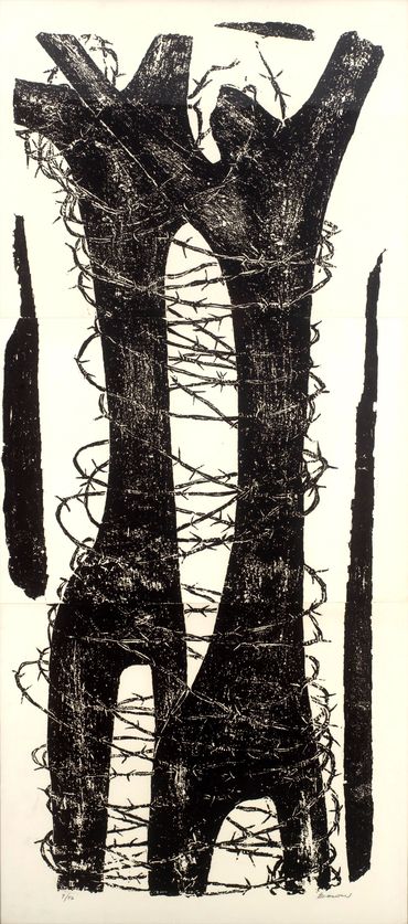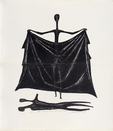 By the mid-1950s, her transition from the established technique of woodcut to engraving on sandstone marked a decisive turning point in her artistic practice. As Yannis Bolis astutely observes, this shift expanded both the expressive potential and the scale of her works, igniting new formal concerns. Katraki’s pioneering choice of sandstone over the traditionally used limestone was by no means incidental. As a sedimentary rock composed of compacted quartz grains, sandstone is rough, porous, and brittle. Its uneven erosion and limited capacity to retain ink "paved the way for large forms and broad, free gestures." Simultaneously, it’s harder surface, which necessitates sculptural tools and techniques—such as the mallet and chisel—dictates the elimination of redundant detail while enabling monumentality, leading to an intensified simplification and schematisation of the forms. The monumental presence of her dark figures, the emphasis the volumes through slashes, and their predominantly vertical arrangement evoke a preclassical iconographic type reminiscent of the black-figure ceramics of the Geometric and Archaic periods.