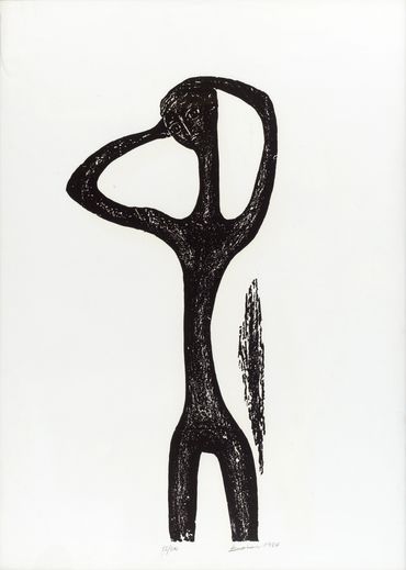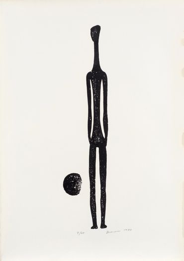 Echoing the increasingly pronounced contours of preclassical art, Katraki’s engravings establish the human body as the thematic nucleus of her oeuvre. Between 1967 and 1968, the sharply defined human and animal figures she drawn in black marker on smooth pebbles served both as a means of processing her exile on Gyaros following the imposition of the Greek Military Junta on 21 April 1967 and as a crystallisation of her robust contours. These contours would come to dominate her rendering of the human form upon her return from exile, where the unmediated exposure to violence and deteriorating health conditions cemented a sombre reality and the prevalence of hurtful bodies. In the wake of both political upheaval and formal experimentation, Katraki’s engraving language approximates more the handling of the human body in works of preclassical Greek cultures, such as Cycladic figurines, the black-figure ceramics of the Geometric and Archaic periods, and Archaic sculpture.
